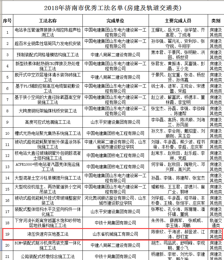 《2018年濟(jì)南市優(yōu)秀工法》名單出爐,山東機(jī)施榜上有名