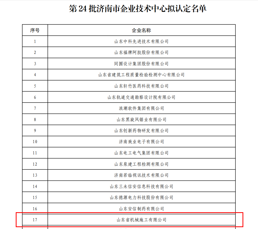 根據(jù)《濟南市企業(yè)技術(shù)中心認(rèn)定管理辦法》和《關(guān)于組織申報2022年度(第24批)市級企業(yè)技術(shù)中心的通知》要求,經(jīng)相關(guān)區(qū)縣推薦,市工信局組織專家進(jìn)行材料評審和現(xiàn)場考察,山東省機械施工有限公司獲評濟南市企業(yè)技術(shù)中心。