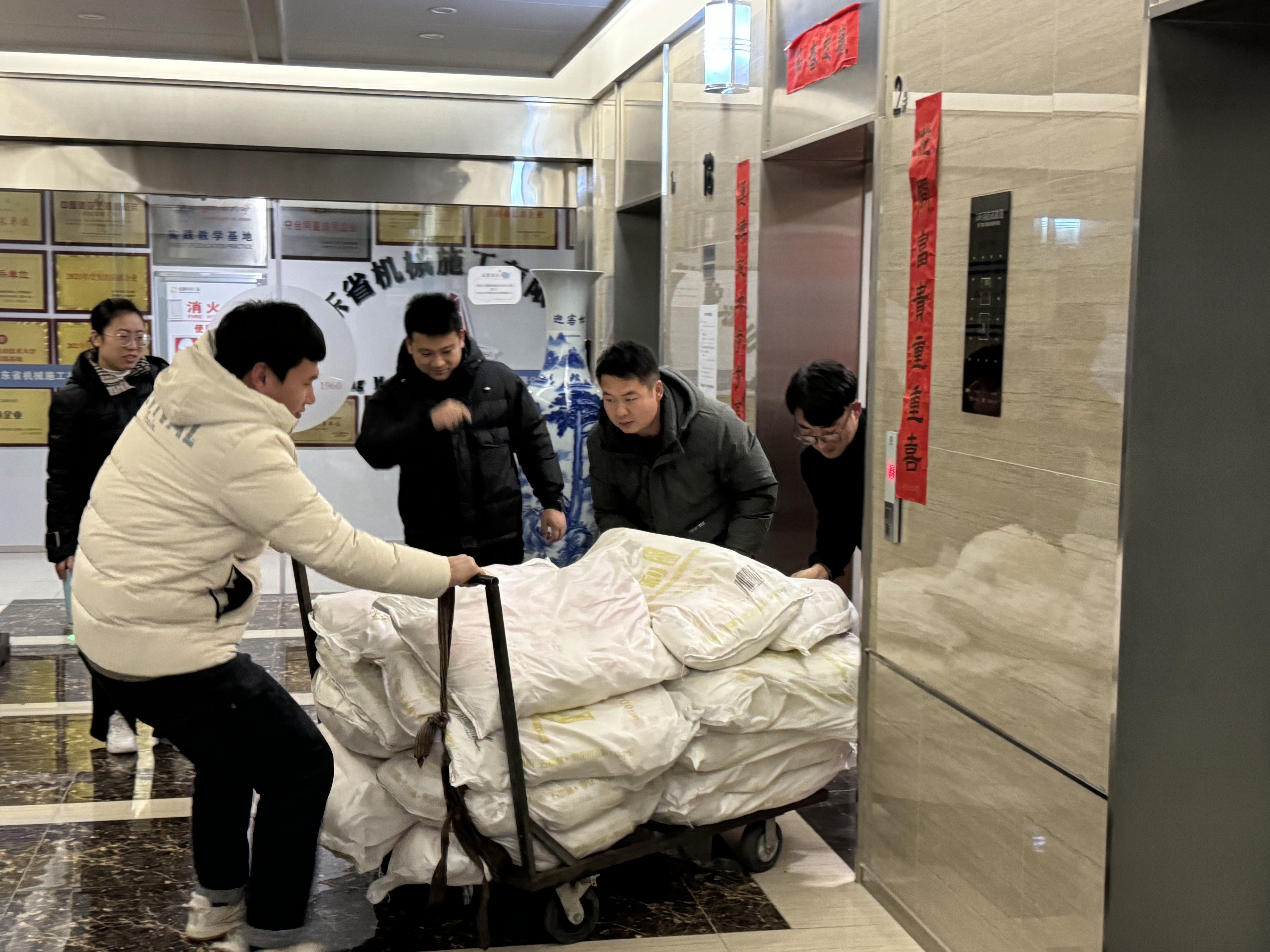 由于配發(fā)的物資實在太多,部分員工還出動了小推車來搬年貨,幸福的笑容洋溢在臉上,溫馨祥和的氛圍漫過了冬日的嚴寒。