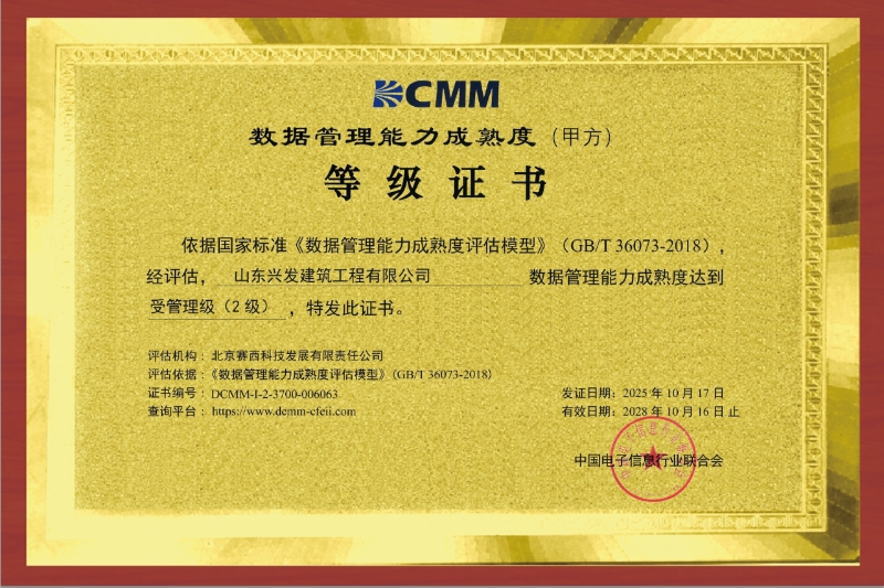 【喜訊】山東省機(jī)械施工有限公司(山東興發(fā)建筑工程有限公司)成功斬獲數(shù)據(jù)管理能力成熟度(DCMM)2級認(rèn)證!